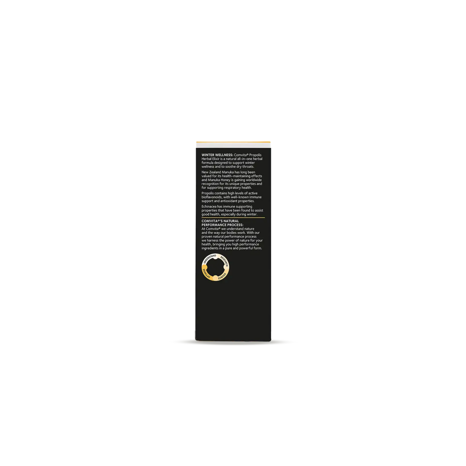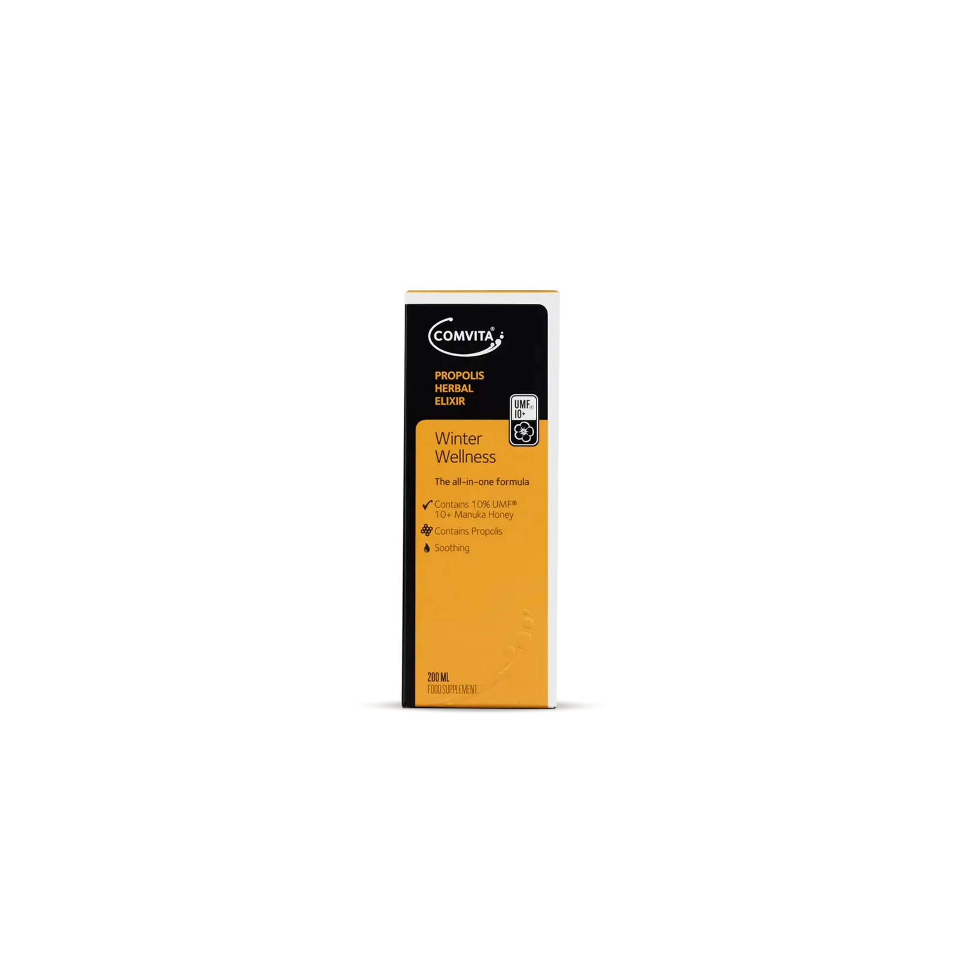 Comvita® Propolis Herbal Elixir is a herbal formulation designed to provide support for winter ills and chills and to soothe dry throats . Comvita® Propolis Herbal Elixir offers support for the body’s immune response and recovery , soothes dry throats and helps clear airways.