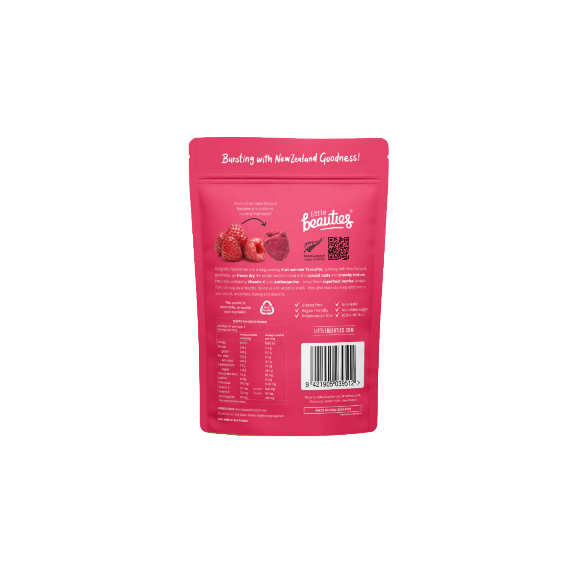 Little Beauties Whole Freeze-Dried Raspberries bring the taste of a Kiwi summer to your snack time all year round.