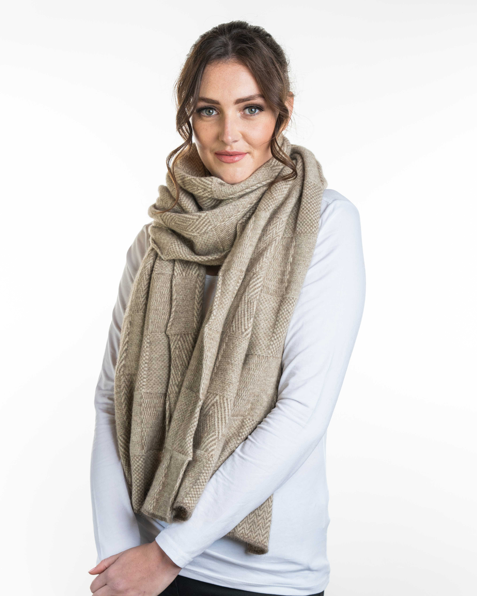 Expertly crafted from a luxurious blend of 65% Merino Lambswool, 25% Possum Fur, and 10% Silk, this wrap is soft, lightweight, and wonderfully warm, offering both comfort and sophistication.