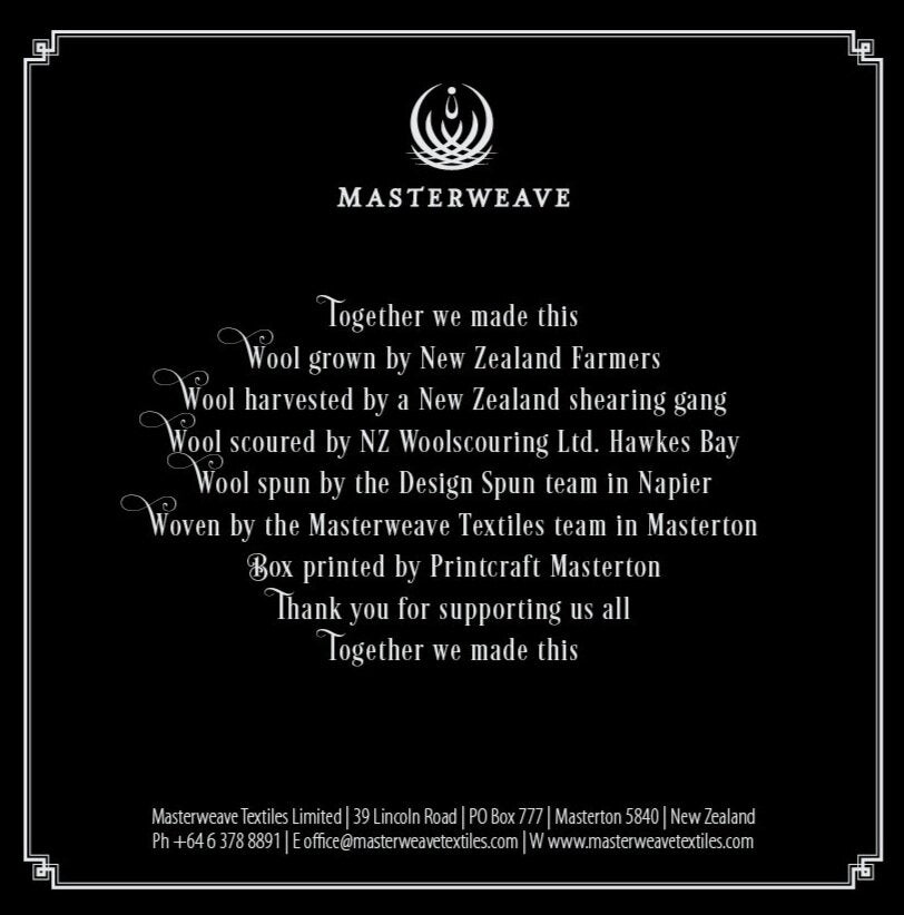 Included with your purchase is a card that describes the journey the wool has taken from a natural product through to the finished blanket. Here at Masterweave our team of weavers have taken great care to provide you with a quality natural blanket that will last for generations.